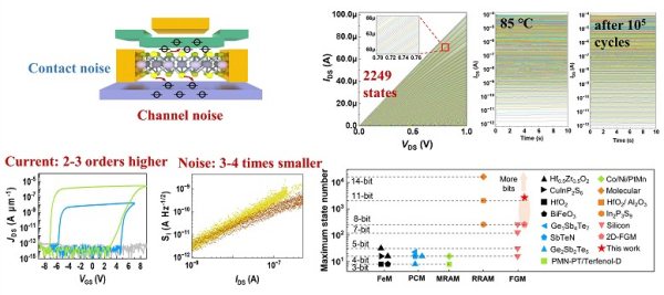 近期,中国科学院国家纳米科学中心在二维浮栅晶体管中,实现了11比特状态的稳定存储。该突破主要得益于以下三方面的协同创新:一是采用Bi/Au金属电极,有效降低MoS2晶体管的肖特基势垒高度,使其开态电流提高至100µA,电流存储窗口扩大至108,同时电流噪声降至仪器检测极限;二是开发双脉冲编辑方法,抑制缺陷态捕获电荷对存储状态稳定性的干扰;三是利用栅注入模式,使重复擦写操作所产生的介电层缺陷态远离沟道区域,显著提升循环稳定性。