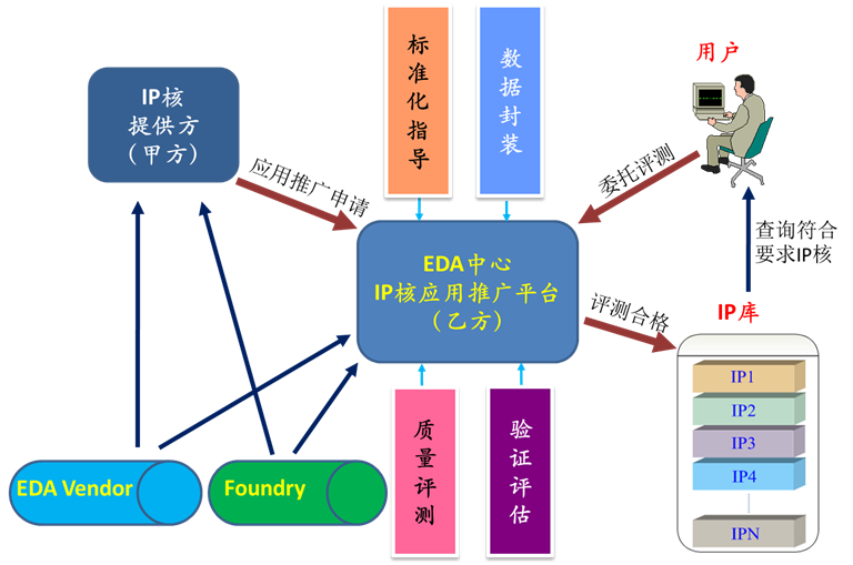 在国家重大科技专项“极大规模集成电路制造技术及成套工艺”中,中国科学院微电子研究EDA中心承担“移动通信与数字媒体芯片IP共性技术推广”研究任务,基于课题组牵头编制的国内首个强制军用IP核标准《GJB7715-2012军用集成电路IP核通用要求》,建立IP核应用推广平台,开发IP核主观评测电子表格(IPQE),在此基础上,完成多款移动通信与数字媒体芯片IP核的数据封装和质量评测服务: