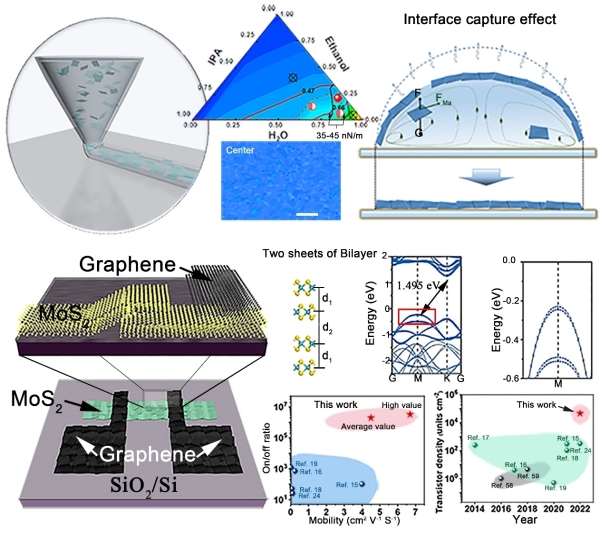 二维(2D)半导体材料为将摩尔定律扩展到原子尺度提供了机会。与传统基于蒸镀和光刻技术的加工技术相比,印刷电子因成本效益、灵活性以及与不同衬底的兼容性而受到关注。目前,印刷的二维晶体管受到性能不理想、半导体层较厚和器件密度低的制约。同时,多数二维材料油墨通常使用高沸点溶剂,随之而来的问题包括器件性能退化、高材料成本和毒害性等,难以大规模应用。因此,发展简单且环保的策略对于制造低成本、大规模的打印二维材料功能器件具有重要意义。