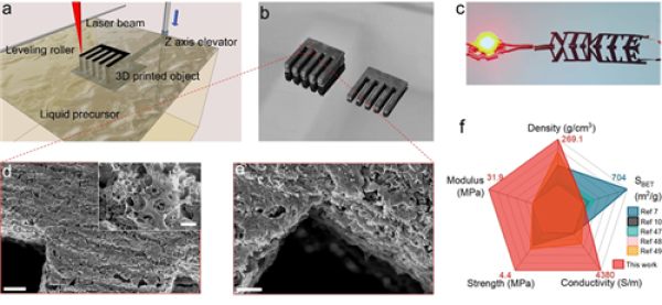 该工作提出了全新的3D打印原理(Selective Laser Transforming,SLT,图3),即通过对液态前驱体的逐层转化实现对石墨烯材料三维结构的定制化构造,对于当前有限的碳材料3D打印技术做出了重要扩充。由于不熔不溶不聚合,开发适用于碳材料的3D打印技术长期以来被视为是一项挑战。而与现有的打印策略相比,除了在原理上具有本质的不同之外,这种通过面单元原位生长的打印方式的优势在于打印过程简单高效以及打印得到的产品具有高结构连续性。SLT打印过程避免了传统的高耗能高污染的氧化石墨烯的制备,且得到的打印产物无需额外的高温退火还原过程。打印产物的电导率和强度分别达4380 S/m和4.4 Mpa,优于传统的3D打印石墨烯材料。