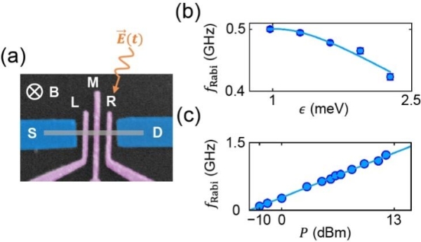)对自旋比特操控速率的调控。(c) 自旋比特操控速率随微波功率增加而增加,最快操控速率超过1.2 GHz。