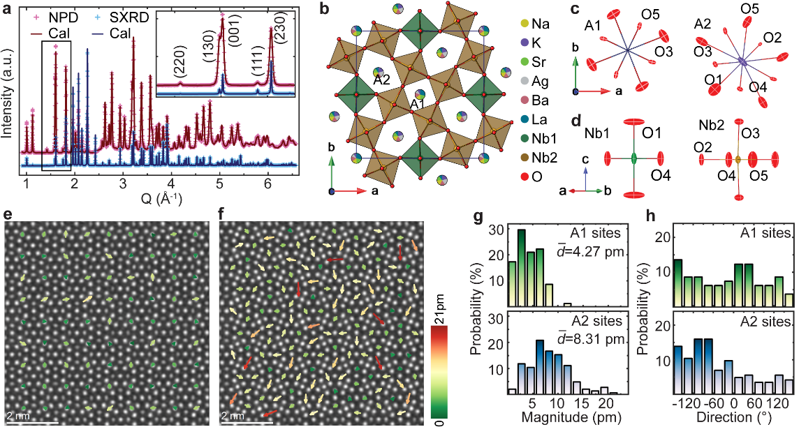 (a-d)TTB高熵陶瓷的结构精修,(e-h)TTB高熵陶瓷的晶格结构畸变