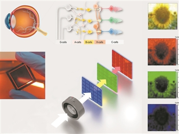 美国宾夕法尼亚州立大学科学家从大自然中汲取灵感,开发出一种新设备,可通过模仿人眼中的红、绿、蓝光感受器和神经网络来生成图像。他们用模仿人类视锥细胞的窄带钙钛矿光电探测器创建了一个新的传感器阵列,并将其连接到模仿人类神经网络的神经形态算法,以处理信息并生成高保真图像。研究发表在最新一期《科学进展》上。