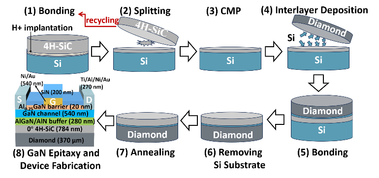 近日,微电子所刘新宇研究员团队与青禾晶元公司、南京电子器件研究所等单位团队合作,基于4H-SiC/Diamond复合衬底成功实现了高散热性能的GaN HEMT器件,为突破GaN器件散热瓶颈提供了新的技术方案。