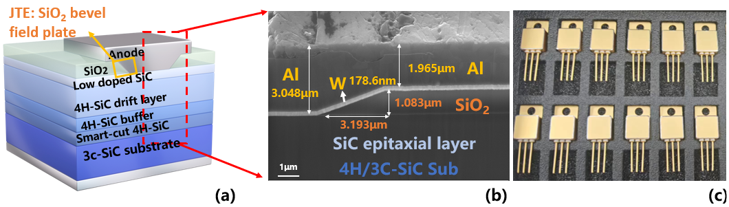 基于该复合衬底,团队成功制备了 200V 肖特基势垒二极管。测试结果显示,器件比导通电阻低至国际同类最优水平0.50 mΩ•cm2,较传统 4H-SiC 衬底器件降低 47%;浪涌电流耐受能力达到 312A,展现出优异的电热鲁棒性。从比导通电阻与击穿电压的对比图来看,4H/3C-SiC工程化衬底上器件性能优于 4H-SiC 衬底上器件极限性能,在击穿电压为 100 V 至 600 V 的范围内,工程化衬底可使比导通电阻降低 3 - 6 倍。可见,新型工程衬底为下一代低压碳化硅功率器件提供了一个富有前景的平台。