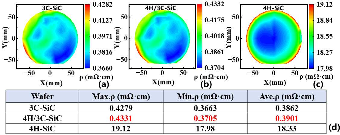 基于此,团队创新性地提出 “高质量4H-SiC薄膜+低阻3C-SiC 衬底”的异质集成方案,既保留 4H-SiC 的高结晶质量与高击穿场强优势,又充分发挥 3C-SiC 的低电阻特性,成功打破了这一长期制约器件发展的“两难困境”,异质集成材料衬底电阻率降至 0.39 mΩ•cm,较传统 4H-SiC 衬底降低 45 倍,为低压SiC 功率器件的性能跃升提供了新质解决方案。