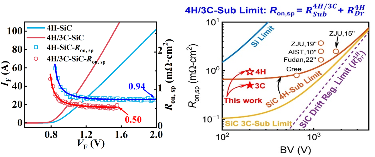 基于该复合衬底,团队成功制备了 200V 肖特基势垒二极管。测试结果显示,器件比导通电阻低至国际同类最优水平0.50 mΩ•cm2,较传统 4H-SiC 衬底器件降低 47%;浪涌电流耐受能力达到 312A,展现出优异的电热鲁棒性。从比导通电阻与击穿电压的对比图来看,4H/3C-SiC工程化衬底上器件性能优于 4H-SiC 衬底上器件极限性能,在击穿电压为 100 V 至 600 V 的范围内,工程化衬底可使比导通电阻降低 3 - 6 倍。可见,新型工程衬底为下一代低压碳化硅功率器件提供了一个富有前景的平台。