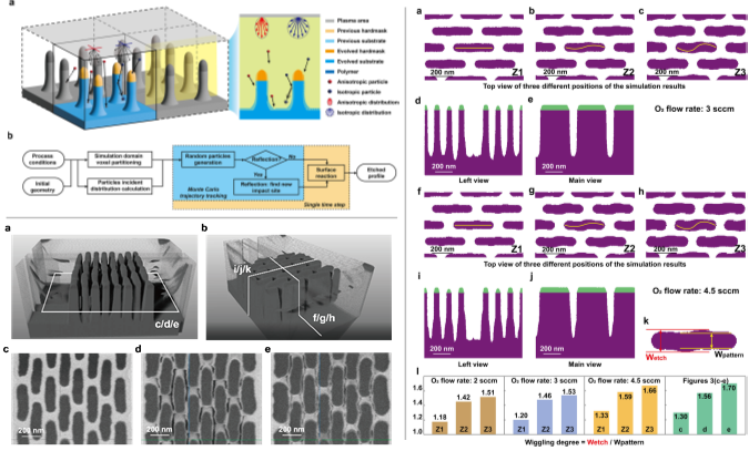 针对上述挑战,中国科学院微电子研究所EDA中心陈睿研究员与先导中心李俊杰正高级工程师、闻静高级工程师、维也纳工业大学Lado Filipovic教授合作,创新性地将聚焦离子束扫描电子显微镜(FIB-SEM)三维重构技术与刻蚀工艺模型深度融合,结合不同工艺条件下刻蚀过程的仿真与实验,揭示了wiggling AA效应的核心机理与调控机制。